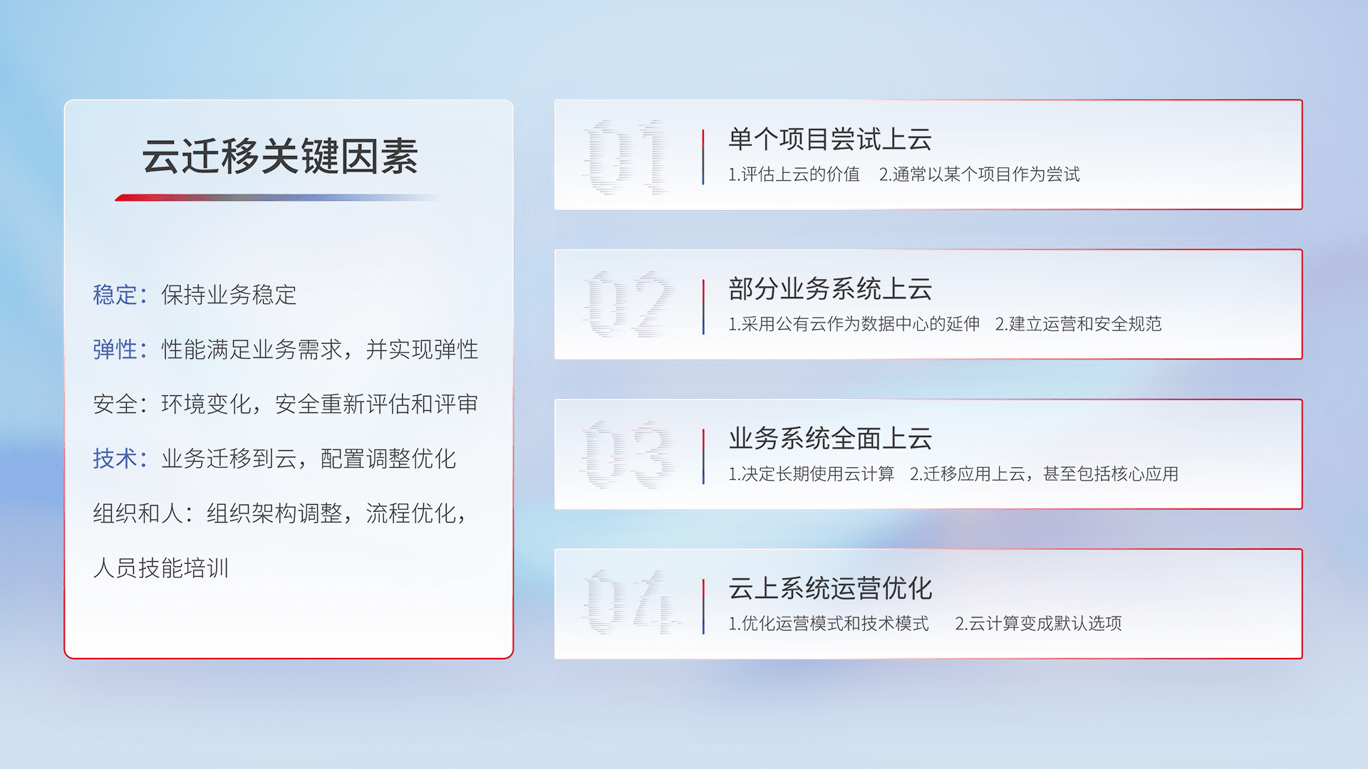 结合实际业务,,,从规划设计、、、云平台选型、、、云原生改造、、、数据迁移、、、集成交付,,,,迁移全过程为客户识别最佳上云路径,,,,做好风险识别管理,,,设计网络架构、、、身份权限、、、、安全审计合规、、、、操作审计、、日志审计、、、监控告警策略、、多站点容灾设计等,,对云上基础设施进行整体规划,,,提升IT治理水平,,,,以满足弹性、、高可用、、、、高性能的需求。。。。