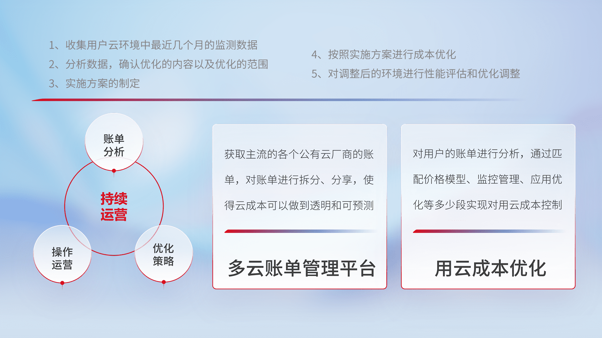 通过多云纳管,,以统一的资源数据模型把客户的云资源进行抽象和封装,,进而实现对多云资源的统一操作,,,保障云资源管理的可靠性、、、、稳定性与可用性。。。量身定制化运维内容,,,,配置、、、开发运维、、、补丁管理、、备份、、监控、、、认证和访问管理、、、审计和日常巡检等,,,,保障在用云过程中的可靠度,,,,稳定度以及高可用率。。。。